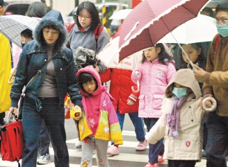 強烈寒流來襲,清晨家長帶著小朋友上學時,都穿上厚重的冬衣。(圖片來源:臺灣《聯(lián)合晚報》)