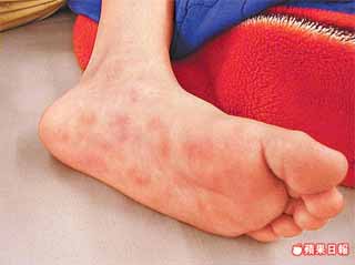 臺(tái)灣劉姓男童打完疫苗的隔天,腳底就出現(xiàn)紅疹。 來源:臺(tái)灣《蘋果日?qǐng)?bào)》
