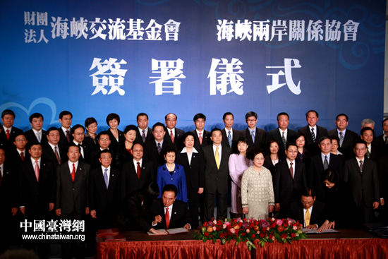 中國臺灣網12月22日臺中消息 22日下午,海協會會長陳云林與臺灣海基會董事長江丙坤在臺中市簽署《海峽兩岸漁船船員勞務合作協議》、《海峽兩岸農產品檢驗檢疫合作協議》、《海峽兩岸標準計量檢驗認證合作協議》等三項協議。(中國臺灣網 李徽 攝)