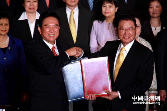 中國臺灣網12月22日臺中消息 22日下午,海協會會長陳云林與臺灣;鶗麻L江丙坤在臺中市簽署《海峽兩岸漁船船員勞務合作協議》、《海峽兩岸農產品檢驗檢疫合作協議》、《海峽兩岸標準計量檢驗認證合作協議》等三項協議。圖為陳云林與江丙坤交換協議文本。(中國臺灣網 李徽 攝)