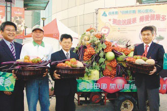 臺灣高雄縣長楊秋興(左三)昨天在高雄市辦捐血活動,并促銷高縣“開心農(nóng)場”的有機(jī)蔬果。圖片來源:臺灣《聯(lián)合報》