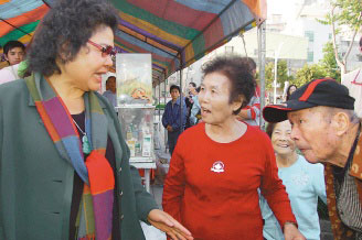 高雄市長陳菊(左一)昨天到左營菜公里參加小區活動,小區老人家熱絡的上前為她加油。圖片來源:臺灣《聯合報》