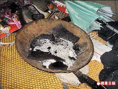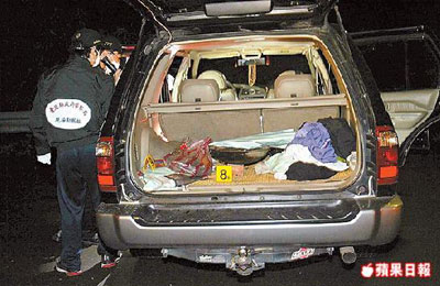 李姓一家四口用來燒炭自殺的炭盆擺在休旅車置物廂。來源:臺灣《蘋果日報》