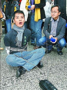 民進黨昨確定“五都”選舉排除黨員投票。會前有市議員參選人將電話線綁身上,反對只靠民調(diào)決定提名。來源:臺灣《蘋果日報》
