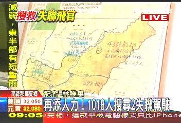 臺軍方表示,繼昨天700多位人力出動后,今天又將出動1000多人,空軍也出動24架次協尋,就是希望盡快能搜尋到失聯的2位駕駛員的下落。(芮文輝)
