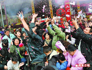 高雄縣旗山開基八路財神廟昨施放“發財大炮”,民眾爭搶從天而降的現金,今天會再施放。來源:臺灣《蘋果日報》