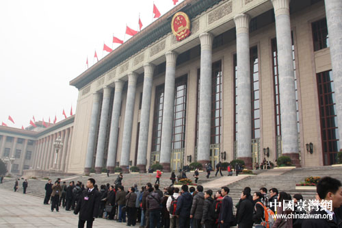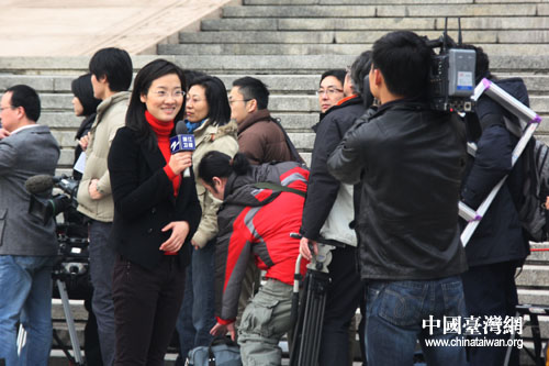 記者們在等待進入大會堂時已經(jīng)開始了自己的工作 (中國臺灣網(wǎng) 徐維彬 攝)