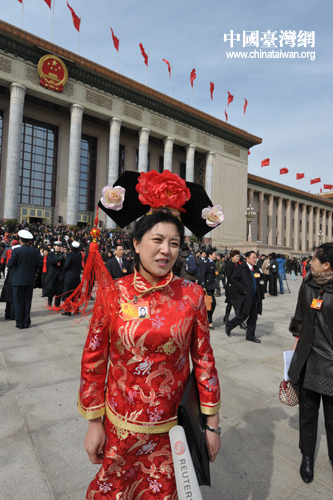 全國人大代表、滿族的那輝滿族裝束驚艷亮相人民大會堂。(中國臺灣網(wǎng)發(fā) 肖春陽、劉洋攝)