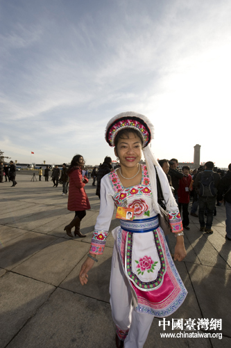 來自云南的全國人大代表王瑛滿臉笑容走向人民大會堂。 (中國臺灣網(wǎng)發(fā) 肖春陽、劉洋攝)