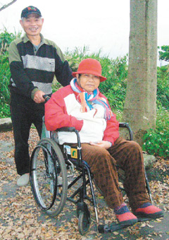 據臺灣《聯合報》報道,68歲的陳正源,體力很好,健步如飛,前年參加插秧比賽還勇奪第一名。每天一早他推著坐輪椅的61歲妻子陳林鳳蘭,到距離住家1公里的田邊、菜園工作。雨天為妻子撐傘,晴天推到樹蔭下,還在菜園放置馬桶,給妻子“方便”。