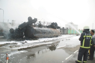 臺中港西碼頭道路轉(zhuǎn)彎處一裝載甲苯的槽罐車翻覆爆炸,引發(fā)大火,司機當場燒死。圖片來源:臺灣《聯(lián)合報》