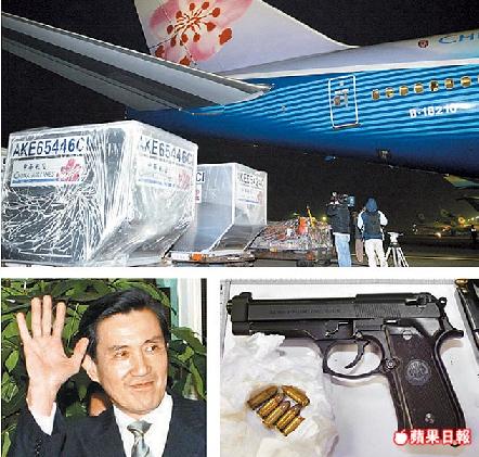 據臺灣“中央社”報道,馬英九1月25日“出訪”中美洲,當天下午,1名女清潔工在桃園機場第二期航廈出境大廳的報紙販賣機后方,發現1個行李,內藏1把改造手槍及12發子彈,引起警方等單位高度重視,并通報特勤中心加強維安工作。