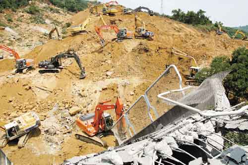 高速公路三號七堵段發生走山,今天上午挖土機等重型機車持續開挖,仍未發現受困人車,圖前方為斷裂的大埔跨越橋面,鋼筋扭曲變形。圖片來源:臺灣《聯合晚報》