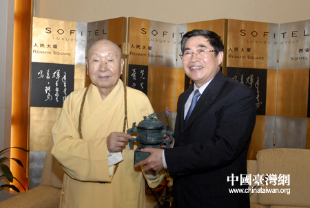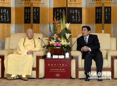 陜西省省長(zhǎng)袁純清會(huì)見(jiàn)惟覺(jué)長(zhǎng)老一行。圖片來(lái)源:陜西省臺(tái)辦
