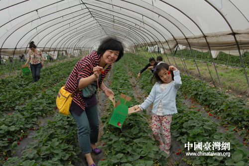 在青浦草莓基地,望見碧葉叢中點綴的紅艷艷的草莓,許多臺灣小朋友早就按捺不住激動的心情,一頭扎進塑料大棚,興奮地采摘起來。媽媽們一面招呼小朋友不要著急,一面為孩子們做著示范,告訴小朋友動作要輕柔,不然很容易碰壞草莓。塑料大棚內,到處是忙碌的身影,處處傳來歡聲笑語,好一幅溫馨、快樂的親子采摘圖。