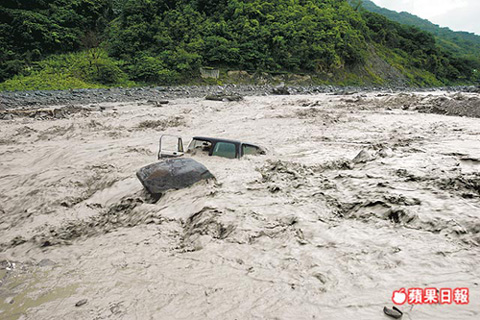 臺東嘉蘭村一輛吉普車原本要去幫忙拖陷在水中的車子,結果不慎反而被大水沖走,還好車上的人及時跳車,并無人員傷亡。圖片來源:臺灣《蘋果日報》