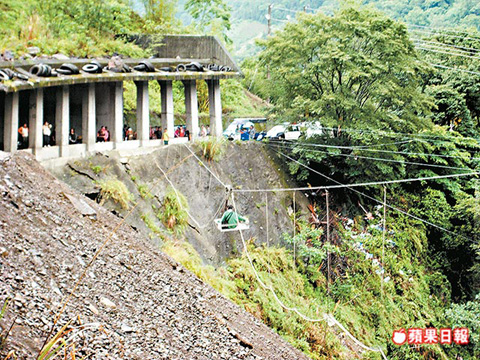 臺灣南投哈比蘭隧道坍方,六十多名游客及住戶受困,靠鋼索滑道脫困。圖片來源:臺灣《蘋果日報》