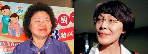 陳菊(左)習慣一襲罩衫、簡單內搭、戴一條單墜項練,頂著細卷的頭發,打出“花媽”名號。“變發圖強”的黃昭順(右)昨天也改變造型,剪掉中長發、改換短發,展現親切風格。圖片來源:臺灣《聯合報》