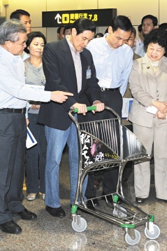 臺灣知名制作人王偉忠曾撰文批評桃園機場行李手推車,數(shù)量不足又缺乏保養(yǎng)。馬英九昨天特別到機場實際體驗新推車的質(zhì)量。圖片來源:臺灣《聯(lián)合報》