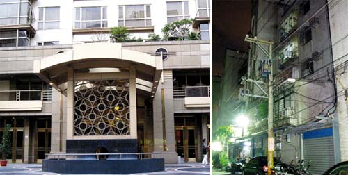 “富家男”溫建和住在臺北市的百達(dá)富麗豪宅(左圖),自稱身價數(shù)億元,他的會計女友梁玉姍月薪四萬元新臺幣,住在臺北縣三重市一棟舊公寓(右圖),卻侵占公款供他花用。圖片來源:臺灣《聯(lián)合報》