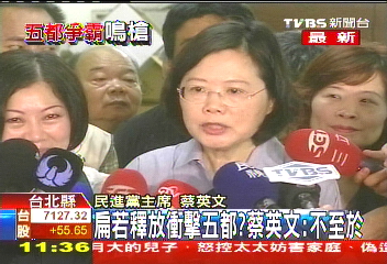 被問(wèn)及如果明天(陳水扁)被釋放,是否會(huì)會(huì)沖擊選情。民進(jìn)黨主席蔡英文說(shuō),“我覺(jué)得不至于啦,因?yàn)椋?jīng)過(guò)這兩年來(lái)的沉淀,還有很多我們的思考,陳水扁的這個(gè)案子,現(xiàn)在大家思考都比較成熟,面對(duì)這個(gè)問(wèn)題也都比較沉穩(wěn),我不認(rèn)為這個(gè)問(wèn)題在我們五都選戰(zhàn)里面,會(huì)有什么很大的沖擊。”
