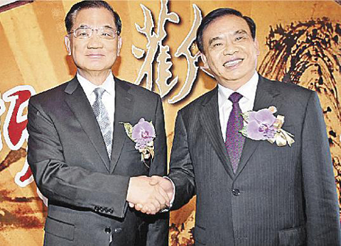 “2010臺(tái)灣·浙江經(jīng)貿(mào)文化合作論壇”昨日登場,浙江省長呂祖善(右)與中國國民黨榮譽(yù)主席連戰(zhàn)于論壇現(xiàn)場握手合影。圖片來源:臺(tái)灣《旺報(bào)》