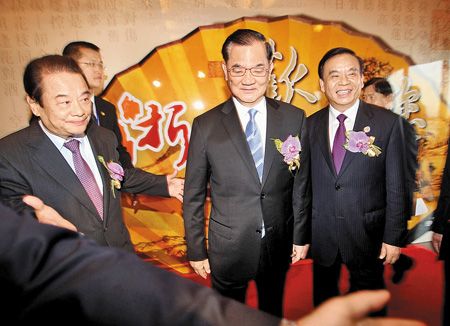 國民黨榮譽(yù)主席連戰(zhàn)(中)與浙江省長呂祖善(右)、在臺(tái)灣工業(yè)總會(huì)理事長陳武雄(左)的陪同下進(jìn)入論壇會(huì)場。圖片來源:臺(tái)灣《中國時(shí)報(bào)》