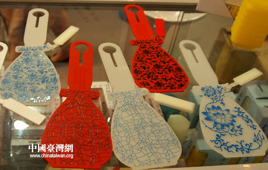圖為第三屆海峽兩岸文博會臺灣文創展區展出的,仿中國瓷器造型的硅膠行李牌。(中國臺灣網 張弛 攝)