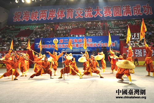 在運動員代表和裁判員代表宣誓后,活動主持人宣布海峽兩岸體育交流大賽開幕。隨后進行的精彩的武術、文藝演出將氣氛推向一次又一次高潮。來自兩岸民間和體育團體表演的舞獅、少林武術、街舞、大型民族舞等節目既表現了民族文化,也傳達了兩岸和平發展的訊息。
