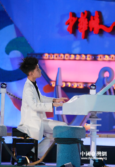 鋼琴小子牛牛深情彈奏,配合芭蕾舞者共同演繹《海峽音畫》。(中國臺灣網(wǎng) 鐘寶華 攝)