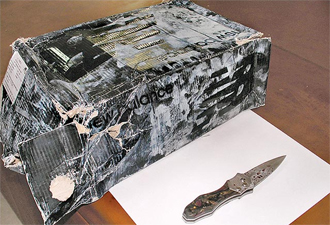 警方在斗毆現場找到沾有血跡的折疊刀及鞋盒。 來源:臺灣《蘋果日報》