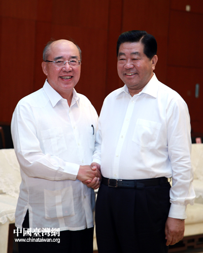 中國臺灣網7月9日廣州消息 中共中央政治局常委、全國政協主席賈慶林7月9日在廣州會見中國國民黨榮譽主席吳伯雄及應邀參加第六屆兩岸經貿文化論壇的兩岸各界人士。(記者 鐘寶華)