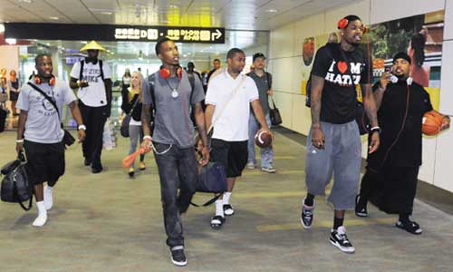 姚明的隊(duì)友布魯克斯搞笑戴起斗笠耍寶。圖片來源:臺灣《聯(lián)合晚報(bào)》