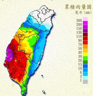 除新營降雨量達(dá)超大豪雨標(biāo)準(zhǔn)外,臺南縣北門鄉(xiāng)、嘉義縣義竹鄉(xiāng)東后寮降雨量為250.5毫米、240毫米,也已超過大豪雨標(biāo)準(zhǔn)(即24小時(shí)累積雨量200毫米以上)。此外,臺南縣下營鄉(xiāng)及嘉義縣樸子鄉(xiāng)降雨也逼近豪雨標(biāo)準(zhǔn)。
