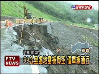 阿里山公路71公里處,因為不時有落石坍方造成交通一度中斷,經過緊急搶修加上實施管制后,才勉強通行。而阿里山公路59公里的路段,路基整個被掏空,路面和護欄都和崩塌的土石一起滾落,現場圍起封鎖線,只能勉強維持單線雙向通車。