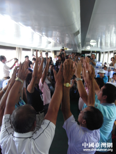 臺(tái)灣文化界人士在漓江上合影留念(中國(guó)臺(tái)灣網(wǎng) 蕪?fù)?攝)