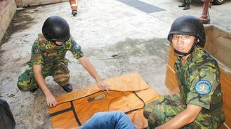 未爆彈處理小組小心將未爆彈轉放到防爆毯內。(圖:臺灣《聯合報》)