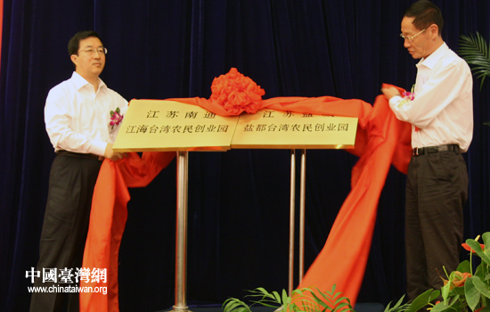 高鴻賓與李維一在開幕式后,為江蘇省新設立的兩個臺灣農民創業園——南通江海臺灣農業創業園和鹽城鹽都臺灣農業創業園揭牌。