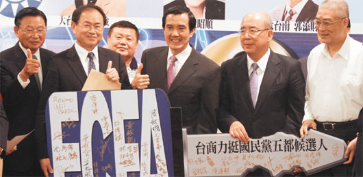 國民黨“五都”市長選舉世界臺商后援總會昨天成立,會長蔡國泰(左二)與馬英九(中)、吳敦義(右一)等,一起表達支持ECFA的決心。(圖:臺灣《聯合報》)
