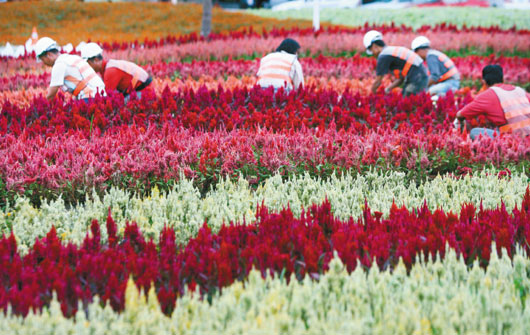 臺北花博圓山展區的花海8日首度曝光,工人們忙著趕工,好讓花博能如期展出 圖片來源:臺灣《聯合報》