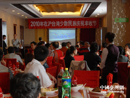 10月10日,上海市臺聯舉辦2010年在滬臺灣少數民族豐收節聯誼活動,在滬的臺灣阿美族、排灣族、泰雅族、平埔族等少數民族家庭20余戶50余人參加了隆重的豐收節慶祝活動。圖為活動現場。(上海市臺聯 王茜 攝)