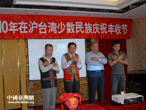 中國臺灣網10月11日上海消息 10月10日,上海市臺聯舉辦2010年在滬臺灣少數民族豐收節聯誼活動,在滬的臺灣阿美族、排灣族、泰雅族、平埔族等少數民族家庭20余戶50余人參加了隆重的豐收節慶祝活動。上海市臺聯副會長張企龍致辭,市民宗委李偉民處長應邀出席并講話,市臺聯副秘書長江國強介紹了臺灣少數民族慶祝豐收節的傳統習俗及臺灣少數民族稱謂的變化,并與高文海、甘錦凱、韓若冰先生分別代表本氏族共同主持祭典。