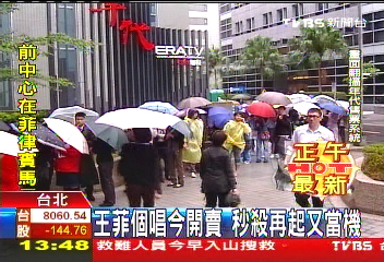 據(jù)臺(tái)灣TVBS電視臺(tái)報(bào)道,今天,王菲臺(tái)北演唱會(huì)開(kāi)始正式售票。因?yàn)橘?gòu)票的歌迷太多,售票網(wǎng)絡(luò)出現(xiàn)擁堵,臺(tái)灣各實(shí)體售票口也出現(xiàn)排長(zhǎng)隊(duì)買(mǎi)王菲演唱會(huì)門(mén)票的人潮。歌迷們表示,不管刮風(fēng)下雨,他們都要來(lái)排隊(duì),因?yàn)榈鹊奶昧恕H欢?0月4日到8日的信用卡預(yù)購(gòu),已經(jīng)有1萬(wàn)張王菲臺(tái)北演唱會(huì)門(mén)票銷(xiāo)售一空,目前只剩下2萬(wàn)張。