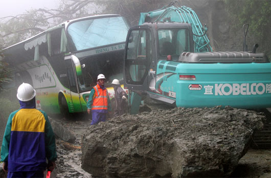 臺風(fēng)“鲇魚”致蘇花公路嚴(yán)重塌方,工程人員22日上午全力搶修道路救援受困的人員 圖片來源:臺灣《聯(lián)合報》