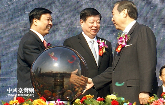 28日,魯臺經(jīng)貿文化交流周暨2010山東臺灣名品博覽會在濟南國際會展中心開幕。圖為山東省委書記姜異康(左)、山東省長姜大明與臺北世貿中心董事長王志剛(右)在開幕式上。(中國臺灣網(wǎng) 張碩 攝)