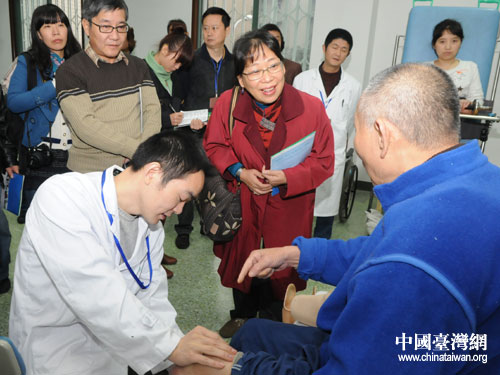 陳芳芝夫婦在四川省肢體傷殘康復中心關切詢問正在做康復治療的殘疾老人。圖片來源:四川省臺辦