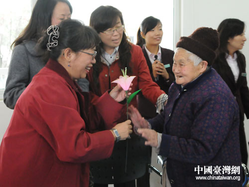 都江堰市綜合社會福利院老人將親手制作的花送給陳芳芝。圖片來源:四川省臺辦
