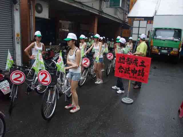 近日,高雄市小港區顯得格外熱鬧和亮眼,一群“坦胸露乳” 的辣妹從清晨開始就騎著單車掃街拜票。不到20度的低溫下,十幾個身穿無袖短衣、下配短到不能短的熱褲的辣妹在大街小巷奔走呼告。如此靚的美女,加之如此大的動作引來居民的不少目光,經打聽得知她們在為高雄市小港區順苓里里長候選人呂在和輔選。