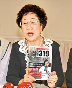 前臺灣地區(qū)副領導人呂秀蓮拿出自己的著作《透視319》,要求臺當局查明319、連勝文兩起槍擊案的真相。她表示,有關319的資料,她早就整理好了,研判以賭盤成分居高。圖片來源:臺灣《中國時報》