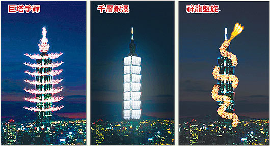 臺北101大樓昨天公布三大主題模擬動畫,其中以“祥龍盤旋”最驚人,由蔡國強縝密設計,利用外墻架設鋼板射出煙火,制造彷彿一條金龍盤旋而上的視覺效果,最后在508米的塔尖射出光束,代表臺灣向上起飛,經濟也上看最高點。(中國臺灣網 王賽賽)